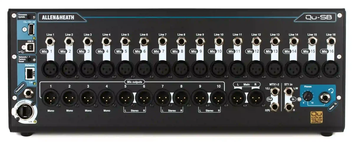 Allen & Heath Mixer Digital Allen & Heath Qu‐sb sở hữu một thiết kế vô cùng nhỏ gọn và tinh tế, làm nổi bật sự chuyên nghiệp và hiện đại. Với kích thước chỉ tương đương một chiếc laptop nhỏ, nó dễ dàng được mang theo trong túi xách hoặc balo, phù hợp với những người thường xuyên di chuyển. Vỏ ngoài của Qu-SB được làm từ vật liệu chắc chắn, đảm bảo độ bền và khả năng chịu đựng va đập trong quá trình sử dụng. Các cổng kết nối được bố trí một cách khoa học và hợp lý, giúp người dùng dễ dàng kết nối với các thiết bị âm thanh khác.
