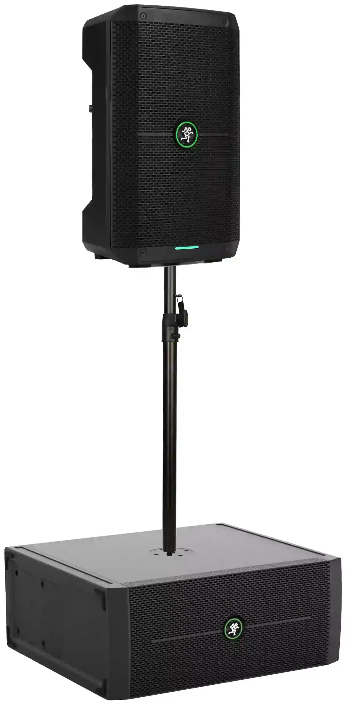 Logo Mackie được đặt ở vị trí nổi bật trên mặt trước của hệ thống, khẳng định chất lượng và uy tín của thương hiệu.